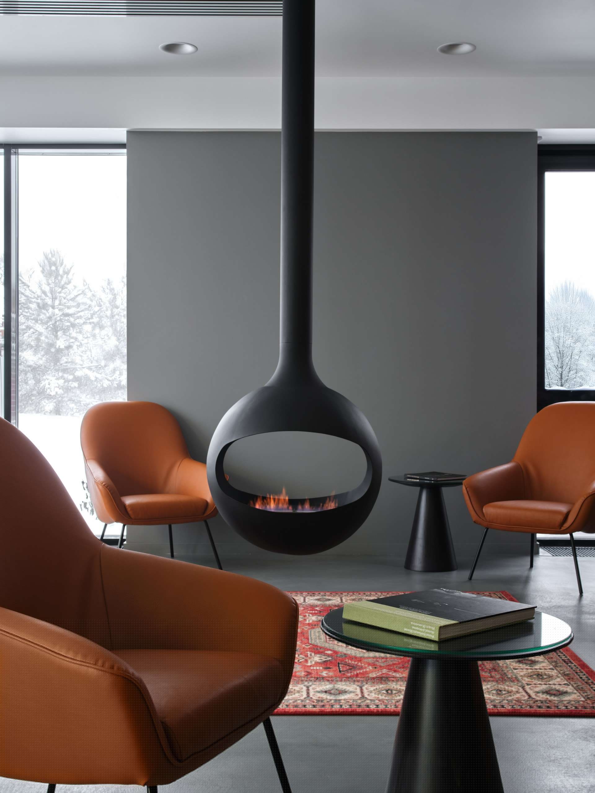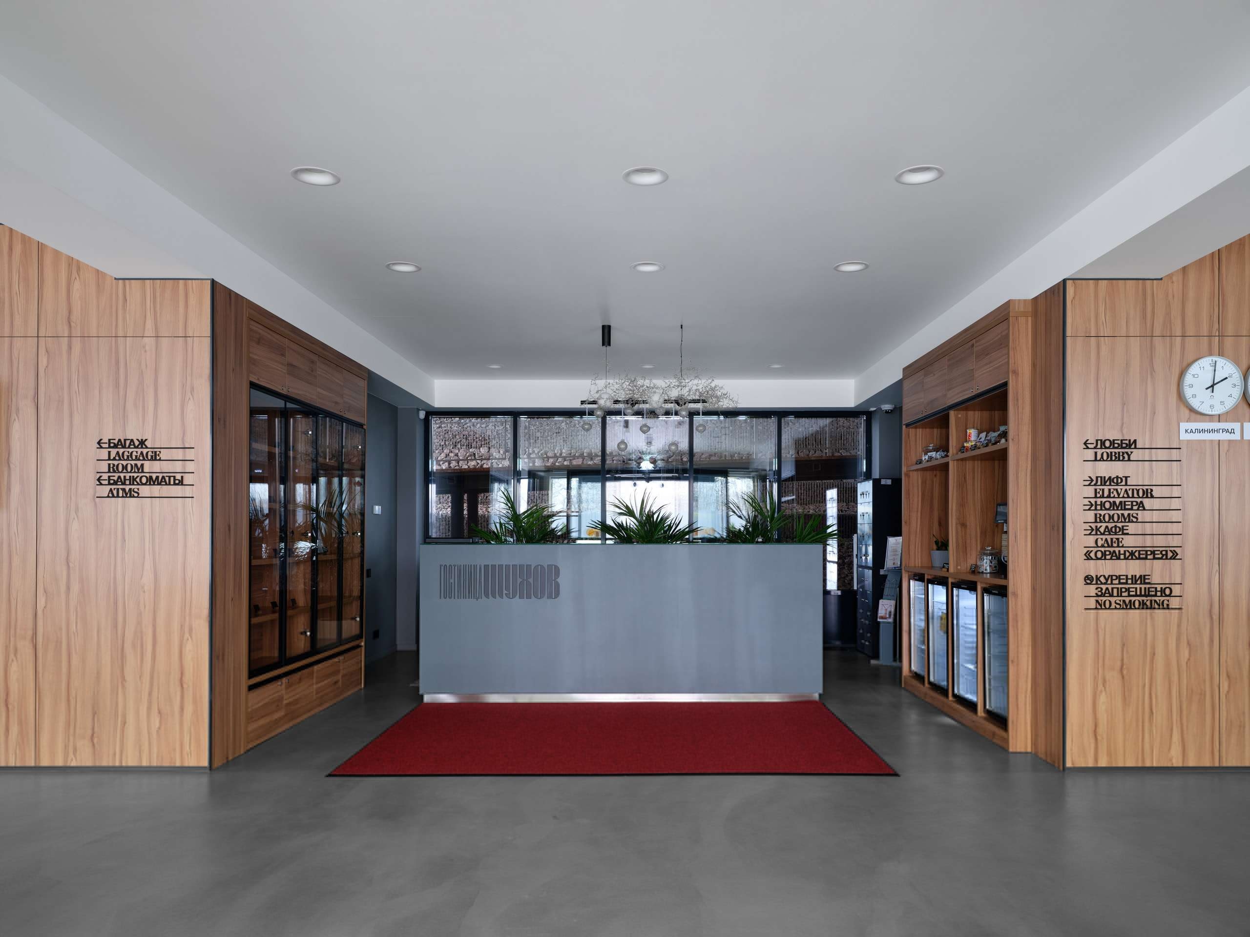 Внизу расположено лобби, приветливо светящееся сквозь витражи первого этажа. Оно сделано подчеркнуто симметричным: по центру бетонная стойка с надписью «Гостиница Шухов», за ней прозрачная стена, за которой кипит гостиничная жизнь. С одной стороны – уютная библиотека, где много дерева, с другой – подвесной биокамин, одновременно лаконичный и приветливый, как и все в этом пространстве. Отсюда же ведут красивая лестница и лифт, соединяющие лобби с рестораном.