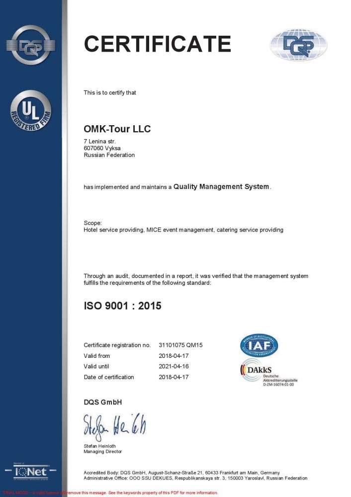 В апреле ОМК-Тур подтвердила действие сертификатов на соответствие системы менеджмента качества требованиям стандарта ISO 9001:2015, ГОСТ Р ИСО 9001-2015. Аудит был проведен российским отделением международного органа по сертификации систем управления DQS GmbH.