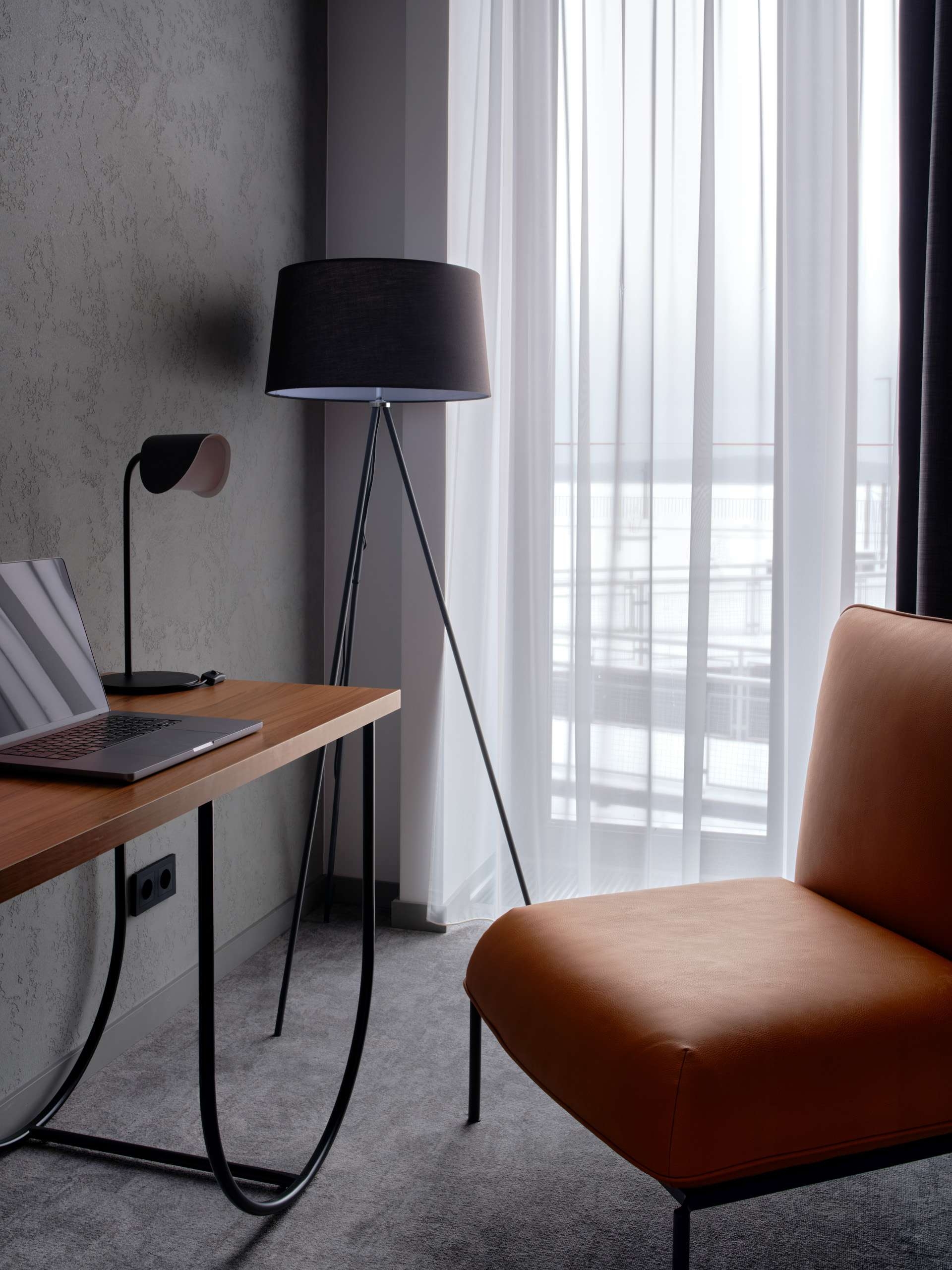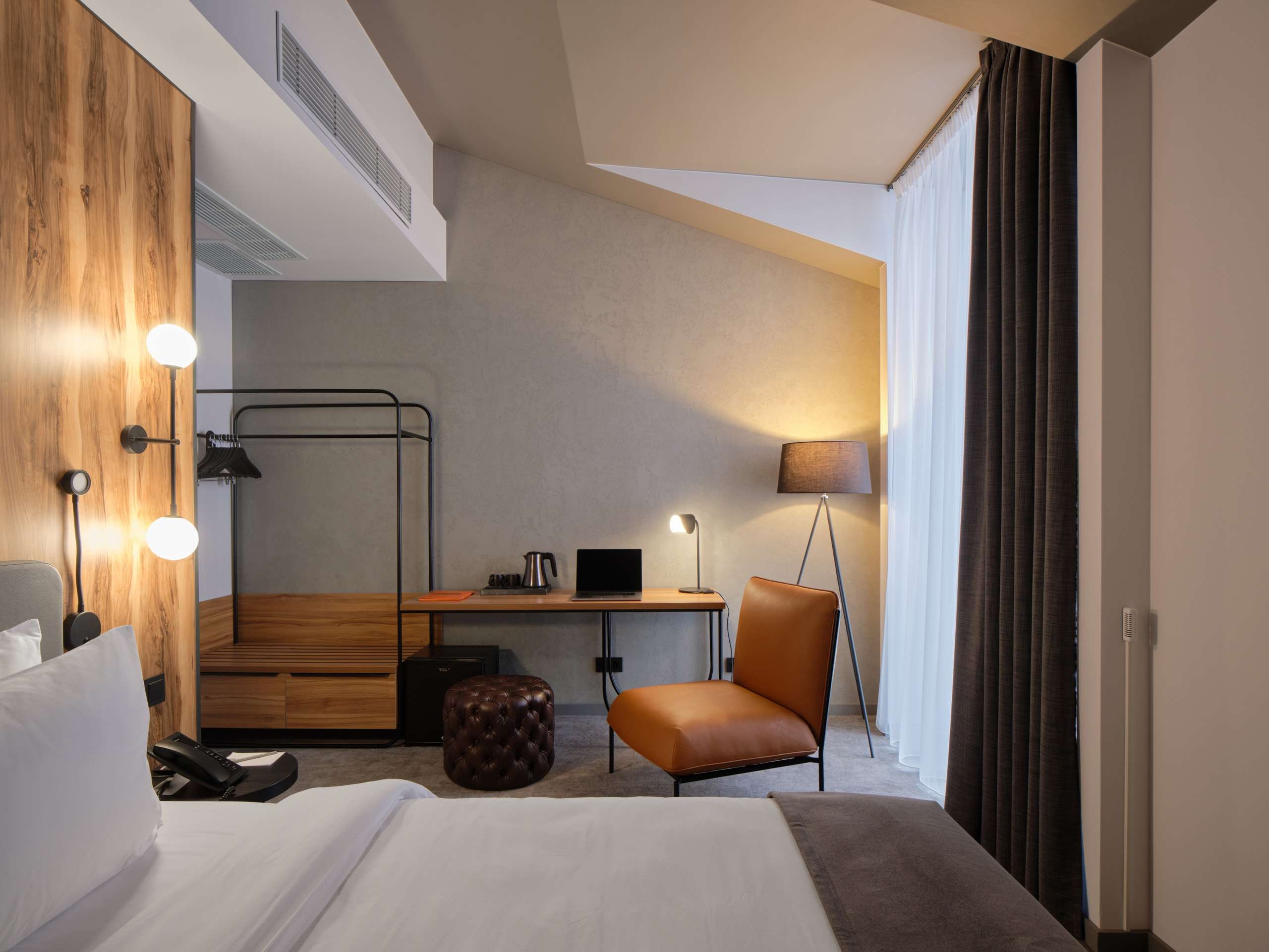 Вытянутая форма здания определила и не совсем стандартную планировку номеров: номера получились неглубокие, но широкие. Это позволило создать для кроватей уютные альковы с облицованным деревом (на самом деле HPL-панелями под дерево) изголовьем. Зато прямо напротив входа удалось разместить панорамные окна, а рядом с ними – рабочую зону. Вся мебель выполнена на заказ из дерева и тонкого металла: как и все в гостинице – она выглядит уютно, лаконично и напоминает об индустриальной эстетике.