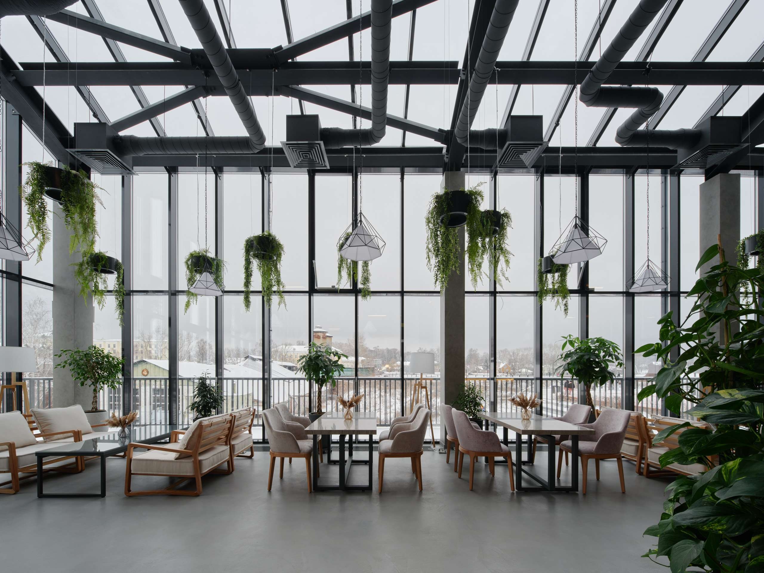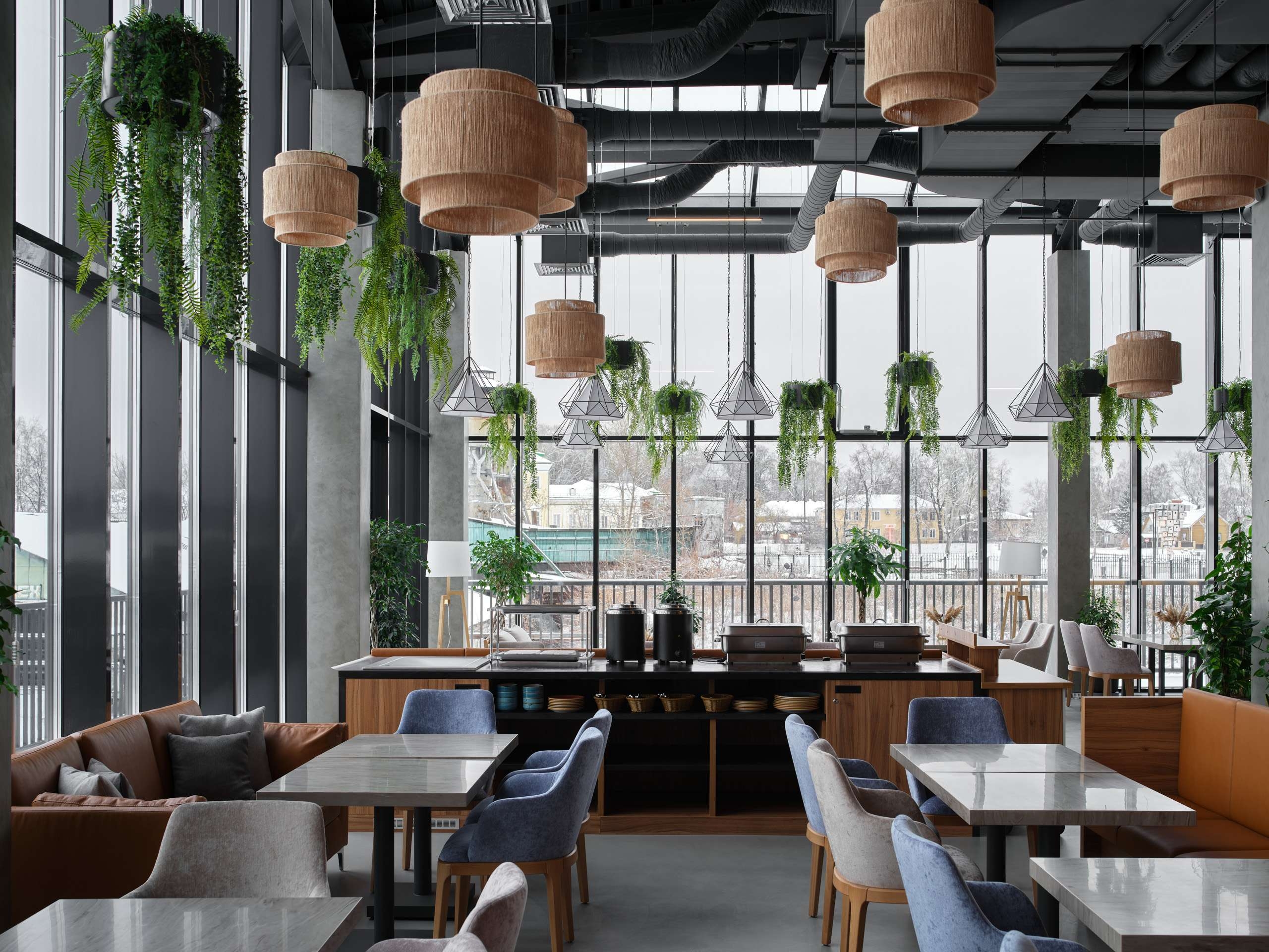 Ресторан работает не только для гостей отеля, но и как ресторан для посетителей парка. За счет огромных во всю стену витражей и перепада высот из кафе открываются, наверное, лучшие в Выксе виды: с одной стороны – набережная, красивый пруд, вдалеке Христо-Рождественская церковь, с другой – бывший завод Баташевых и территория будущего парка. Внутри тоже повторяется тема металла – как материала безграничных возможностей, но при этом интерьер не выглядит слишком брутальным, напротив, довольно легким и ярким: светильники украшают ажурные металлические конструкции, барная стойка тоже облицована металлом, но медного цвета, над ней – алая металлоконструкция. Индустриальные материалы – бетон, стекло, металл – разбавлены теплыми оттенками дерева. И много зелени: все-таки «Оранжерея».
