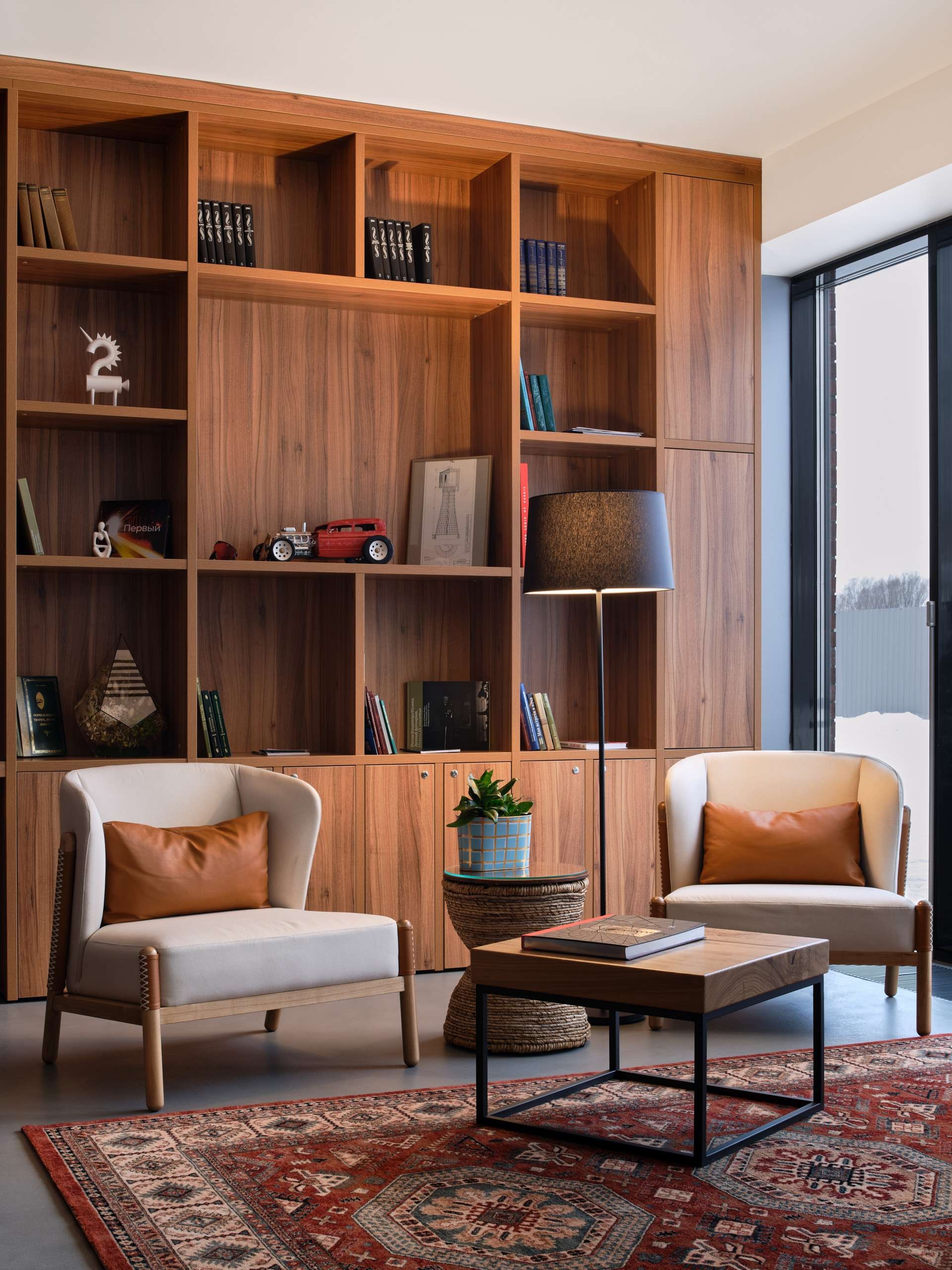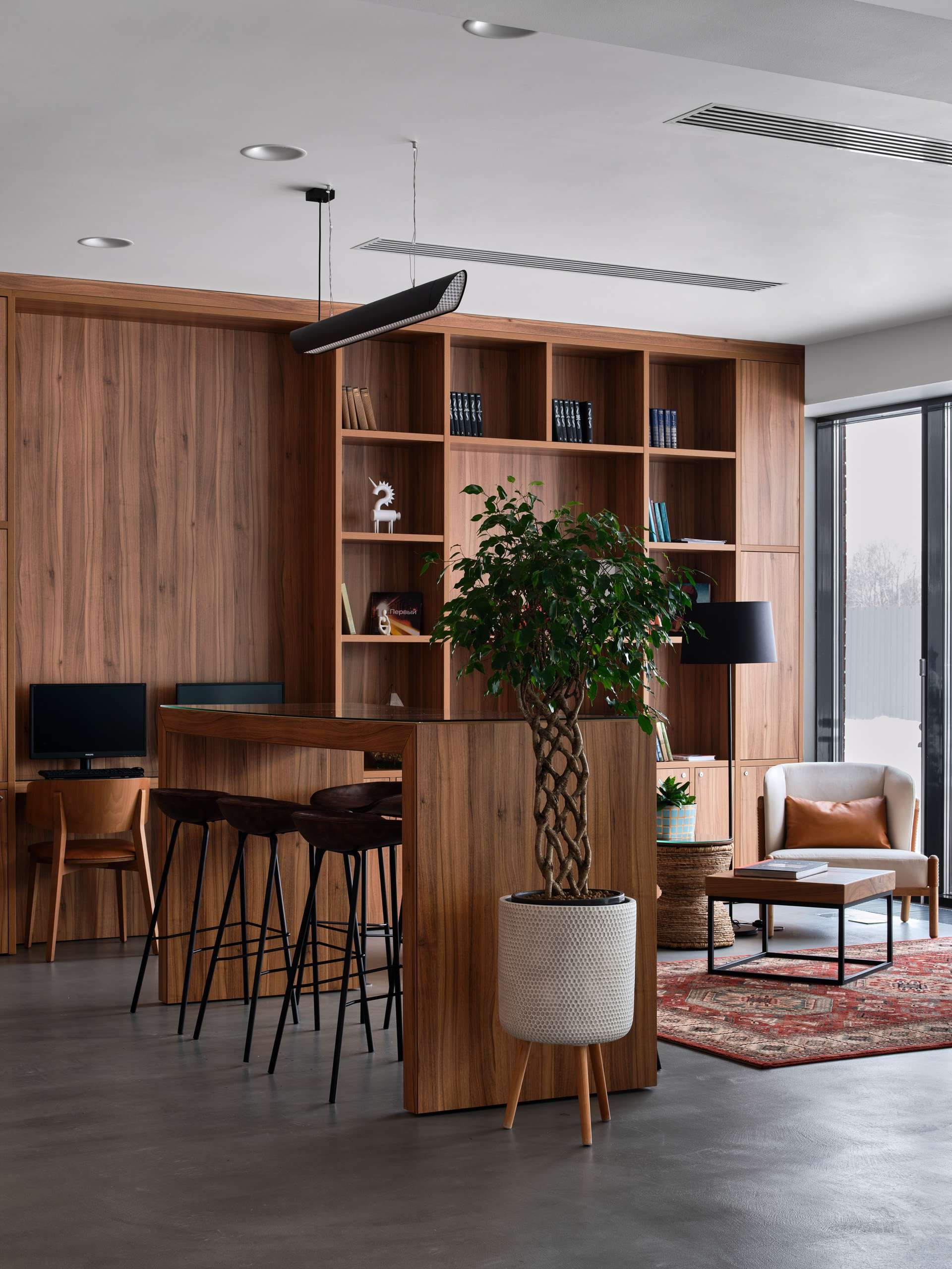 Внизу расположено лобби, приветливо светящееся сквозь витражи первого этажа. Оно сделано подчеркнуто симметричным: по центру бетонная стойка с надписью «Гостиница Шухов», за ней прозрачная стена, за которой кипит гостиничная жизнь. С одной стороны – уютная библиотека, где много дерева, с другой – подвесной биокамин, одновременно лаконичный и приветливый, как и все в этом пространстве. Отсюда же ведут красивая лестница и лифт, соединяющие лобби с рестораном.