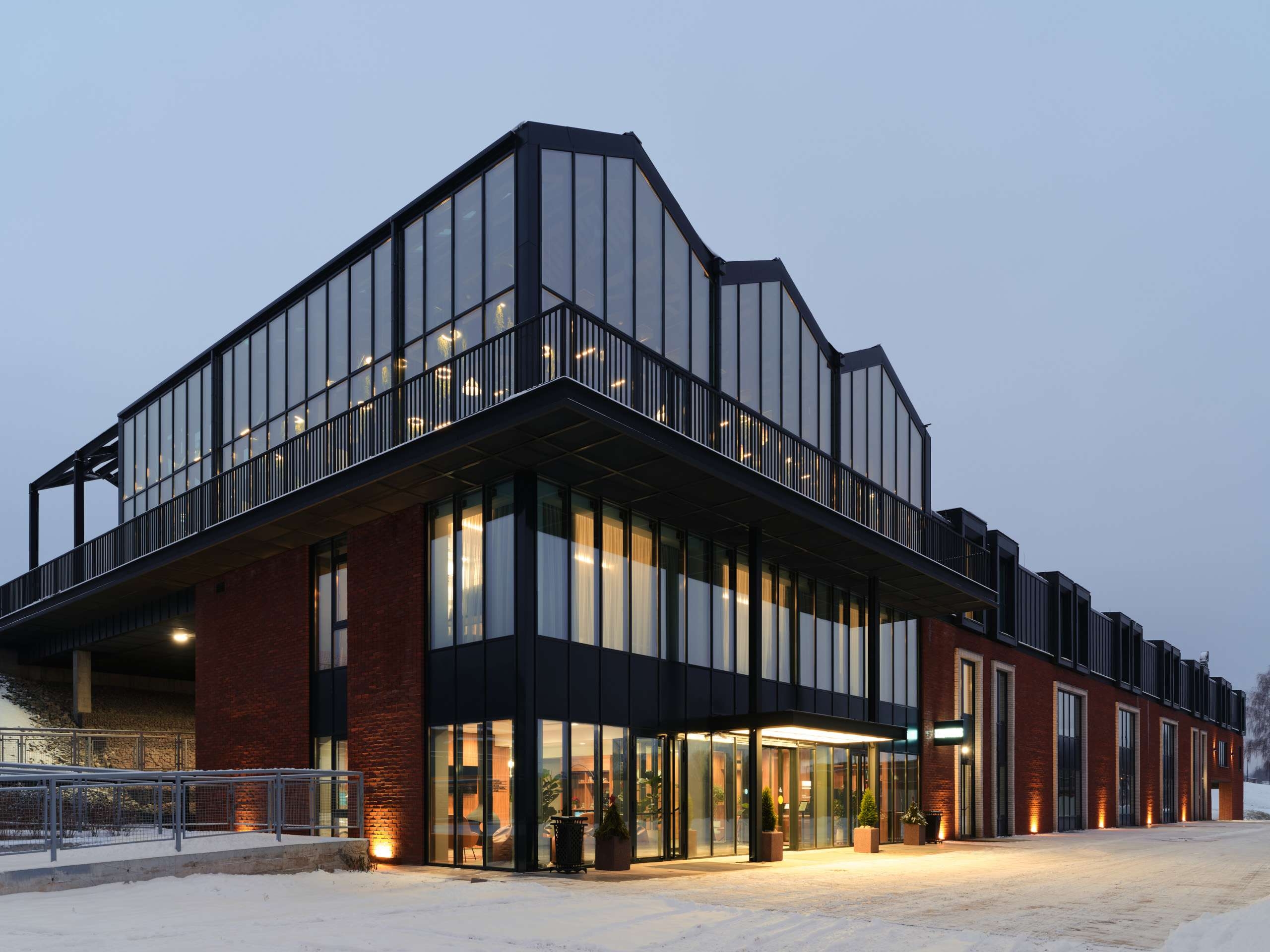 Гостиничные номера собрали в отдельном блоке, что очень эффективно как с точки зрения обслуживания, так и с точки зрения энергоэффективности. Внешне этот объем из-за пятна застройки довольно сильно вытянут, но он не выглядит монотонным за счет крупных оконных порталов и меняющейся в разных частях здания кирпичной кладки. Последняя треть объема пронизана широкой аркой – это рабочая зона отеля, вход для сотрудников и зона погрузки и выгрузки. Чтобы эта часть не выглядела массивной, здесь на смену гладкой клинкерной облицовке приходит фактурный рисунок, добавляющий игры света и тени на фасаде. Номерной фонд занимает второй и третий этажи, помещения первого этажа отданы под служебные функции.